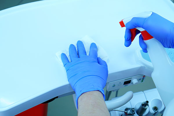Walls, floors and other housekeeping surfaces are cleaned with detergent or a disinfecting cleaner regularly. Disinfection is only done if the surfaces have been contaminated by blood or infectious material. Clinical contact surfaces such as dental units and countertops are disinfected with an EPA-registered surface disinfectant. In some cases, they are covered with a barrier and cleaned at the day’s end.